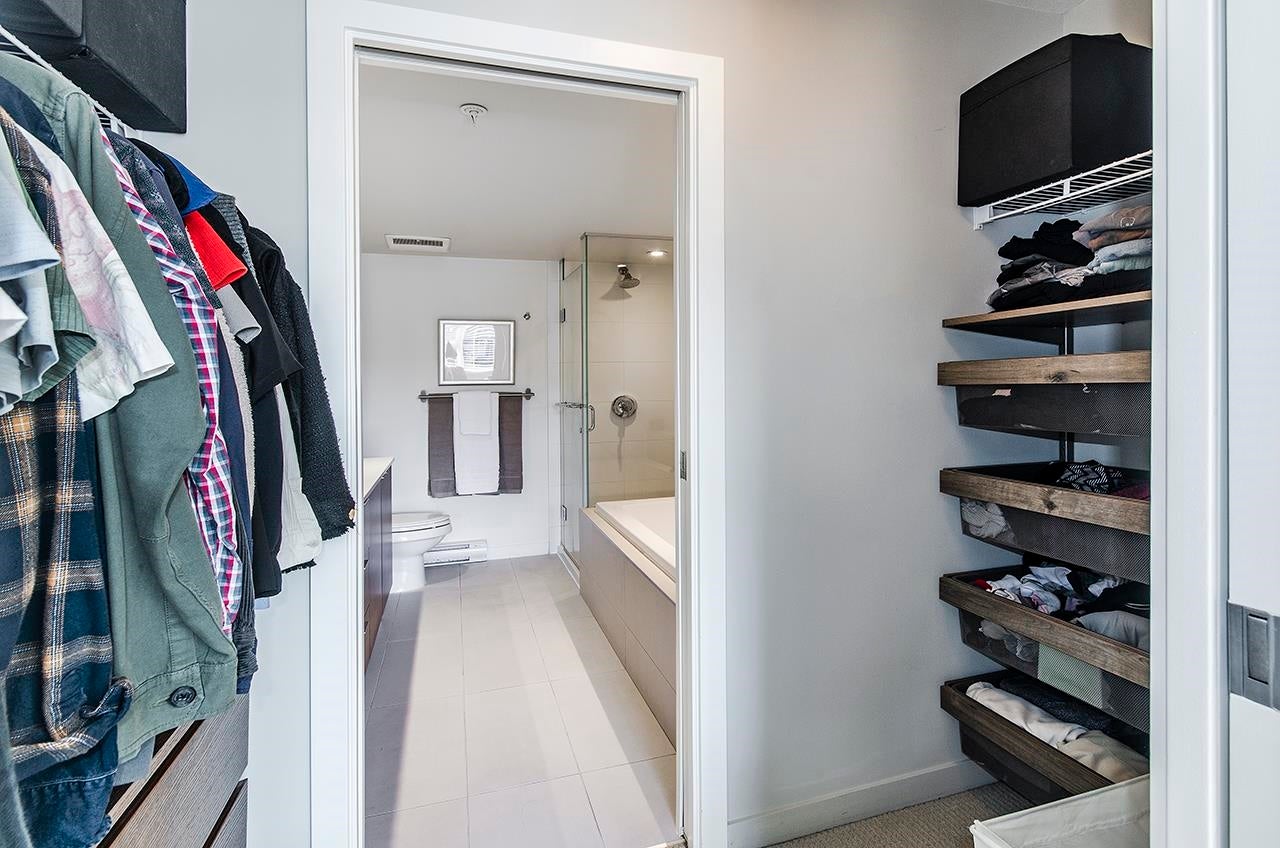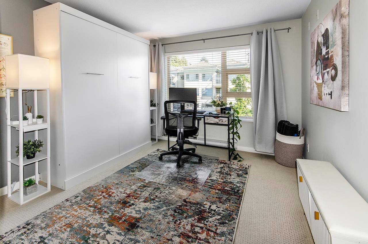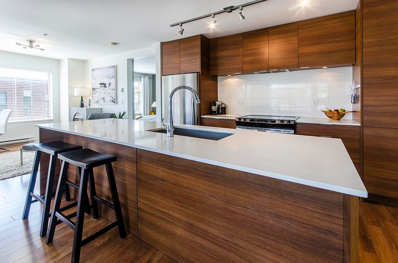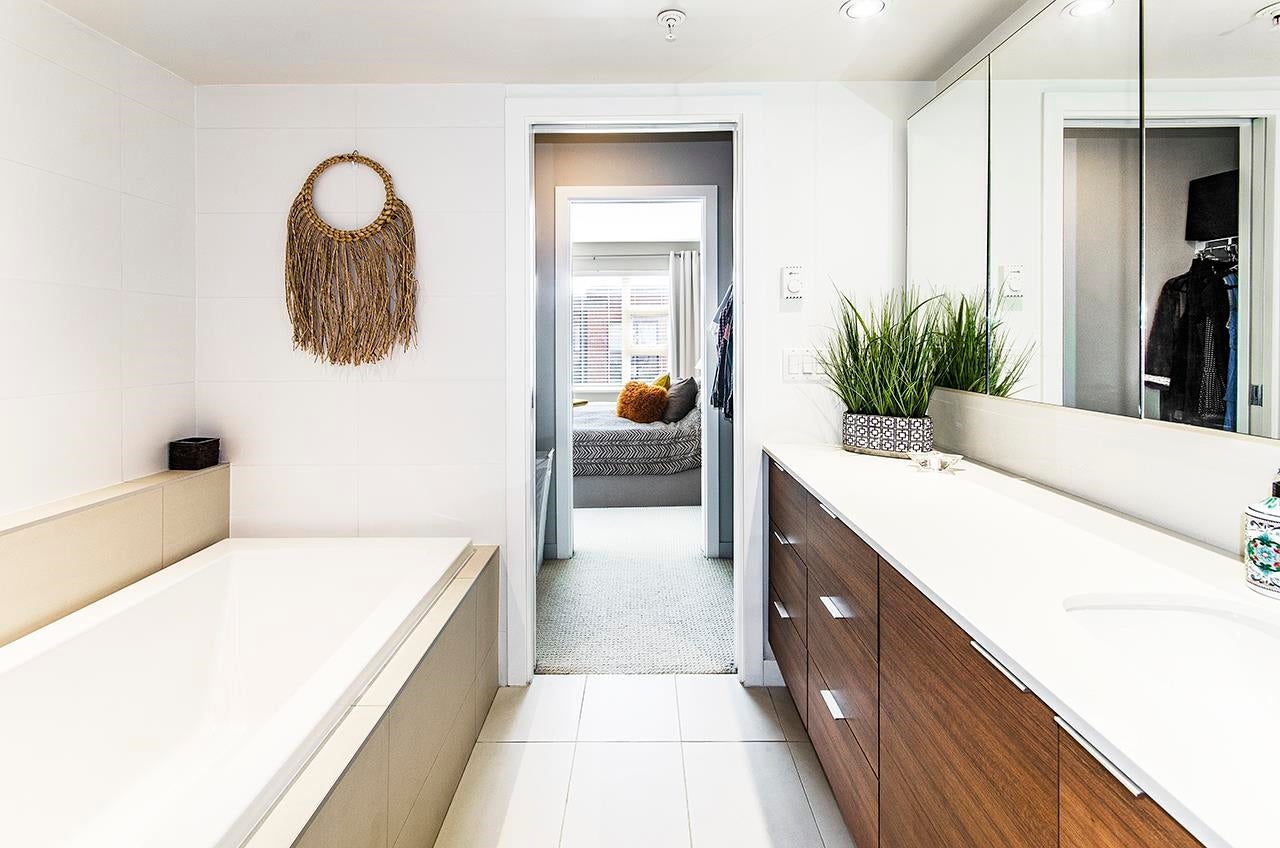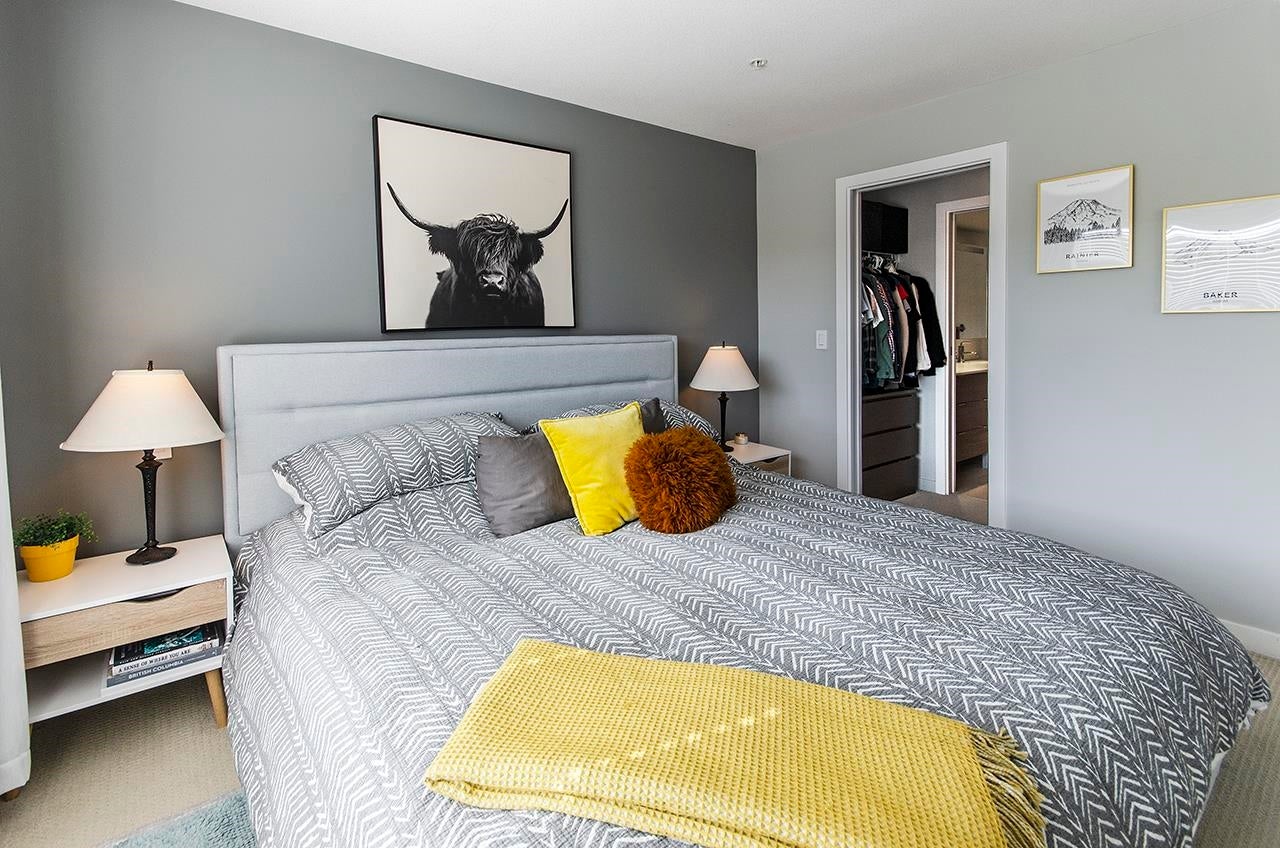 THE BEST CORNER UNIT offering S/E exposure, w oversized windows for loads of natural light. This well thought-out flr plan has a unique open concept living space w 2 good sized bedrooms that are well separated. Gourmet kitch w quartz countertops, lg island w seating for 4, SS appliances & pantry. Spa primary ensuite w deep soaker tub, sep glass shower & lots of counter space. Second bedroom has bath w shower & murphy bed. A spacious, private balcony for BBQs or green thumbs. Freshly painted w attractive panelling in kitchen creates a great canvas. In suite laundry. Pets welcome w lovely trails very close by. Well equipped gym, party rm & bike room in building. Shopping, trails, restaurants & transit all a short walk away. 1 parking, 1 locker & bike storage.