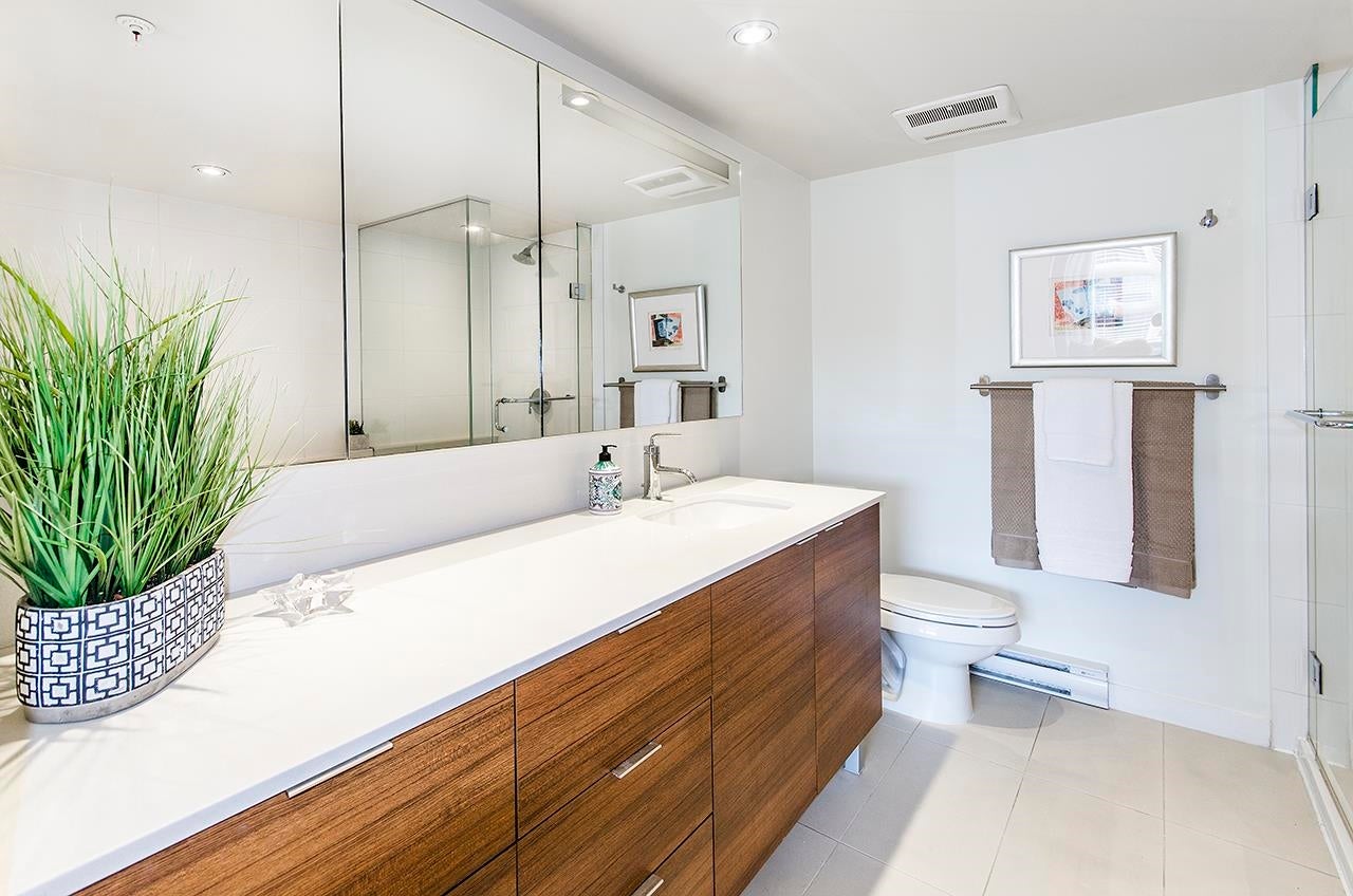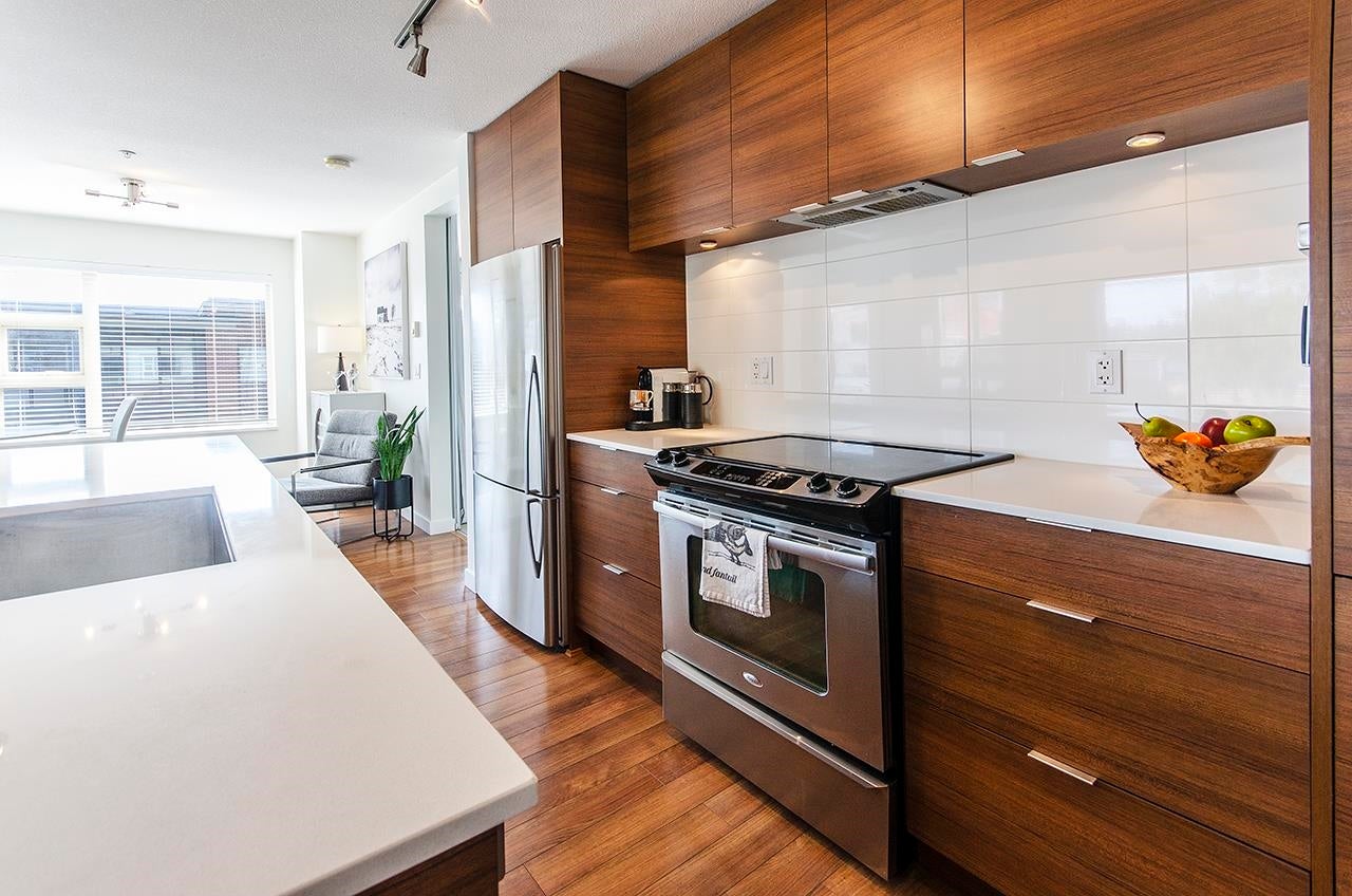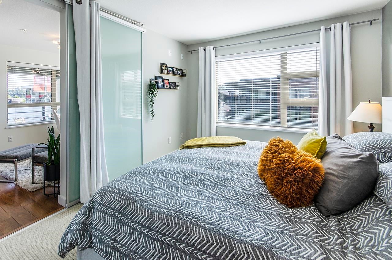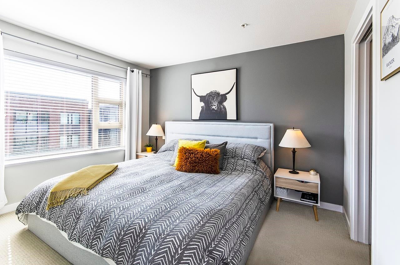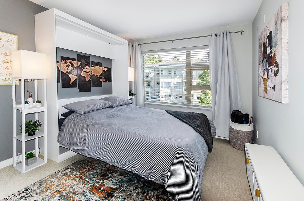 THE BEST CORNER UNIT offering S/E exposure, w oversized windows for loads of natural light. This well thought-out flr plan has a unique open concept living space w 2 good sized bedrooms that are well separated. Gourmet kitch w quartz countertops, lg island w seating for 4, SS appliances & pantry. Spa primary ensuite w deep soaker tub, sep glass shower & lots of counter space. Second bedroom has bath w shower & murphy bed. A spacious, private balcony for BBQs or green thumbs. Freshly painted w attractive panelling in kitchen creates a great canvas. In suite laundry. Pets welcome w lovely trails very close by. Well equipped gym, party rm & bike room in building. Shopping, trails, restaurants & transit all a short walk away. 1 parking, 1 locker & bike storage.