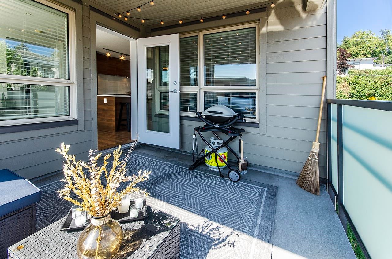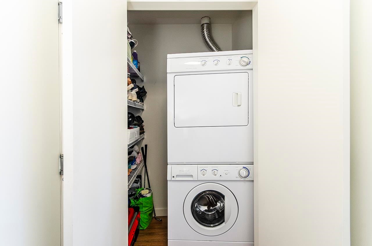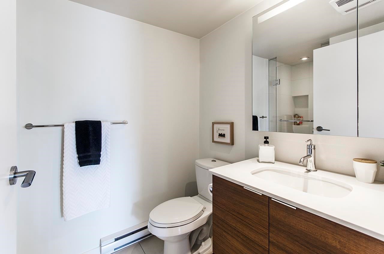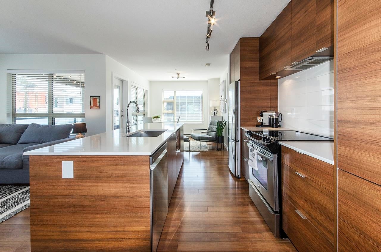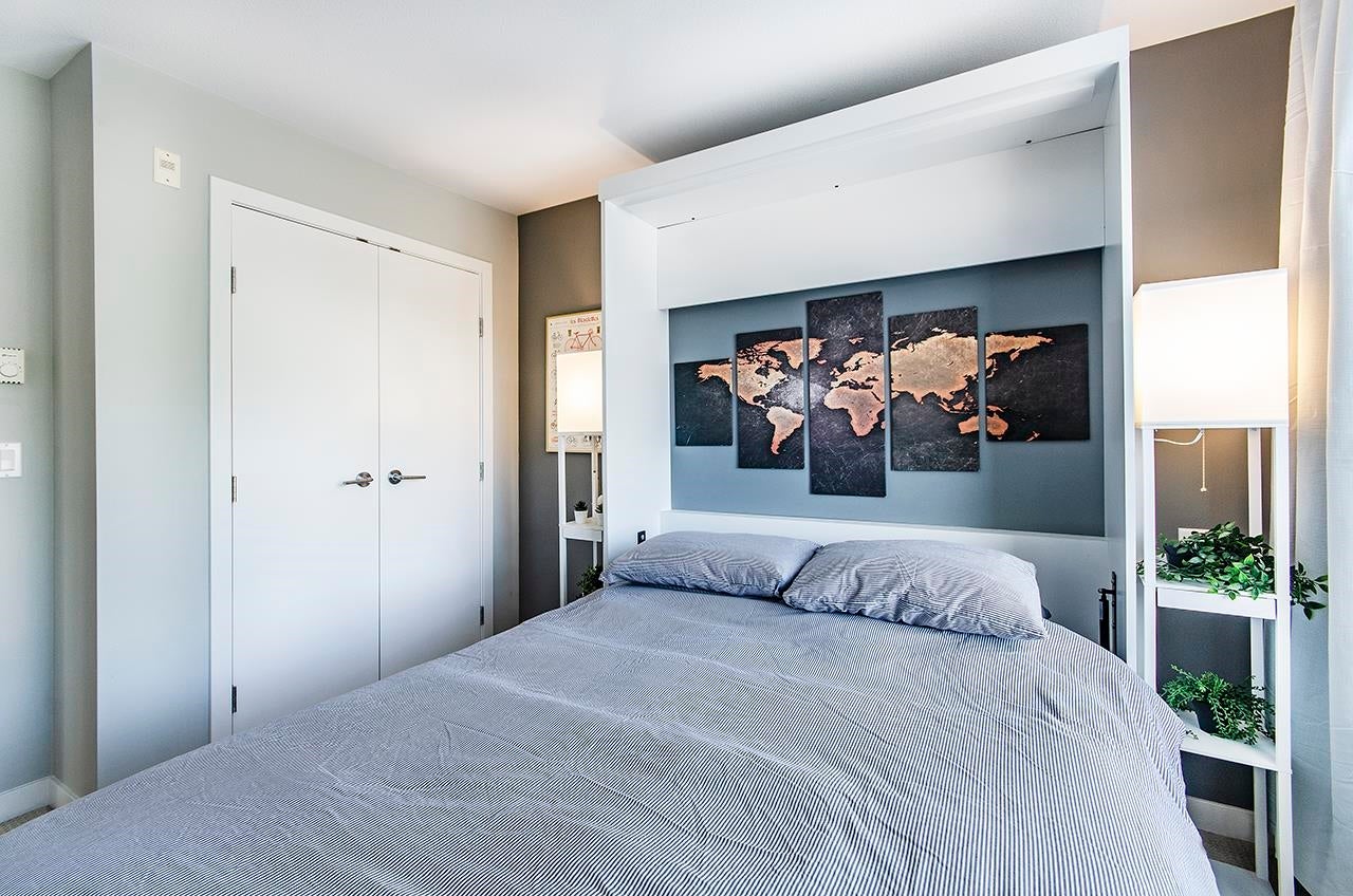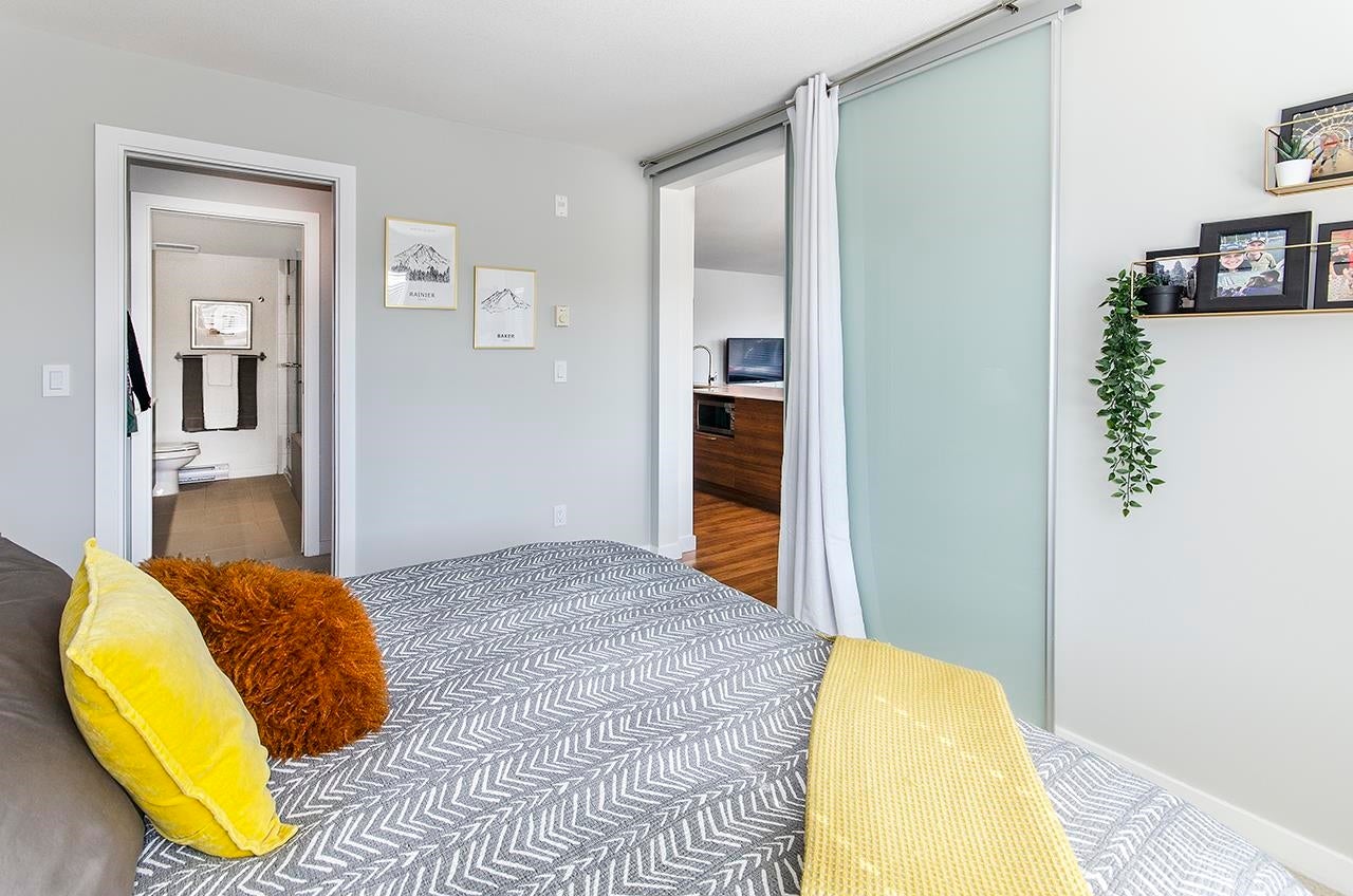 THE BEST CORNER UNIT offering S/E exposure, w oversized windows for loads of natural light. This well thought-out flr plan has a unique open concept living space w 2 good sized bedrooms that are well separated. Gourmet kitch w quartz countertops, lg island w seating for 4, SS appliances & pantry. Spa primary ensuite w deep soaker tub, sep glass shower & lots of counter space. Second bedroom has bath w shower & murphy bed. A spacious, private balcony for BBQs or green thumbs. Freshly painted w attractive panelling in kitchen creates a great canvas. In suite laundry. Pets welcome w lovely trails very close by. Well equipped gym, party rm & bike room in building. Shopping, trails, restaurants & transit all a short walk away. 1 parking, 1 locker & bike storage.