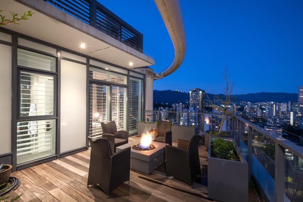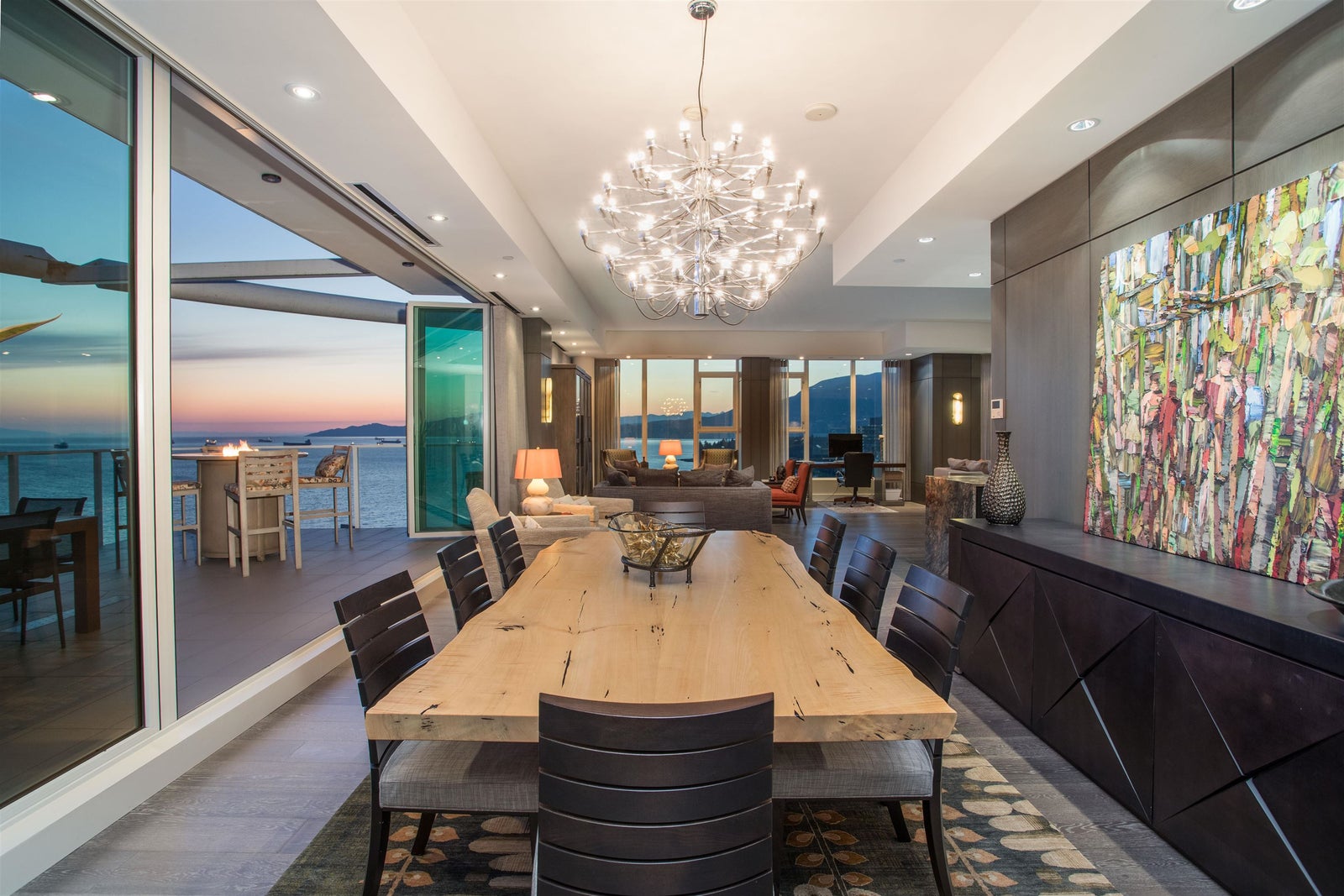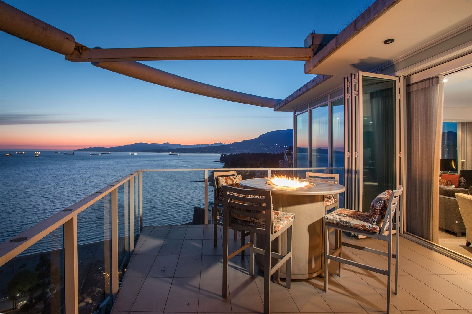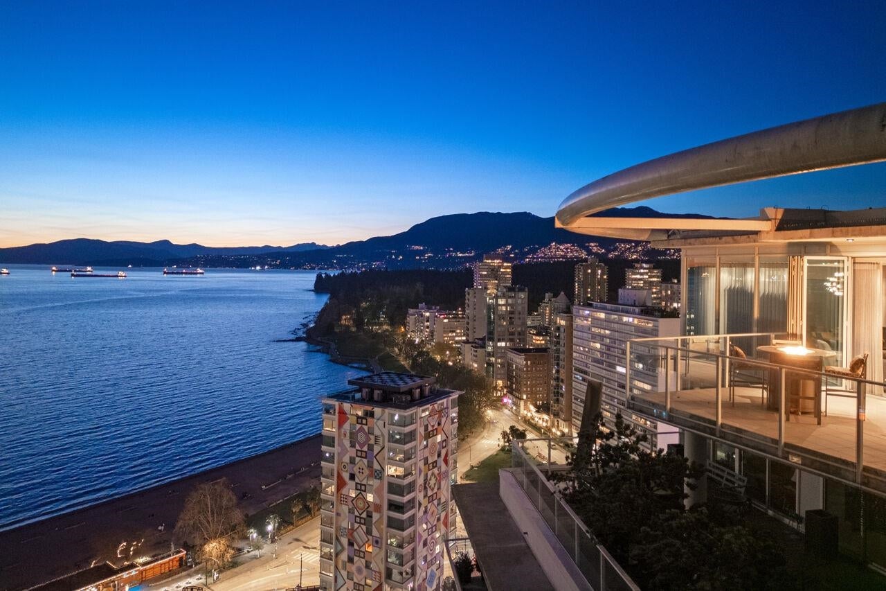 The English Bay Penthouse! Full-floor-2,850 sf PH with 1,500 sf of outdoor space w/ private elevator access and breathtaking all day & night views. Redesigned by Fay Mihailides Design in 2020, it features an 18-ft Wow Fusion kitchen island, Siena tile floors w/ bronze inlay, rift-cut oak wall panels, Rocky Mountain brass hardware, Moooi padded feature walls and custom alabaster lighting. Private primary retreat includes a spa-like ensuite and secluded patio w/ water & mtn views. Two additional ensuite bedrooms also boast private patios and mountain vistas. Two large terraces with multiple lounge zones,lush irrigated gardens & a full outdoor kitchen with Heston BBQ. Rare private 5-car garage outfitted w/ epoxy flooring & smart storage solutions. A true gem! Your only mission is to get home!