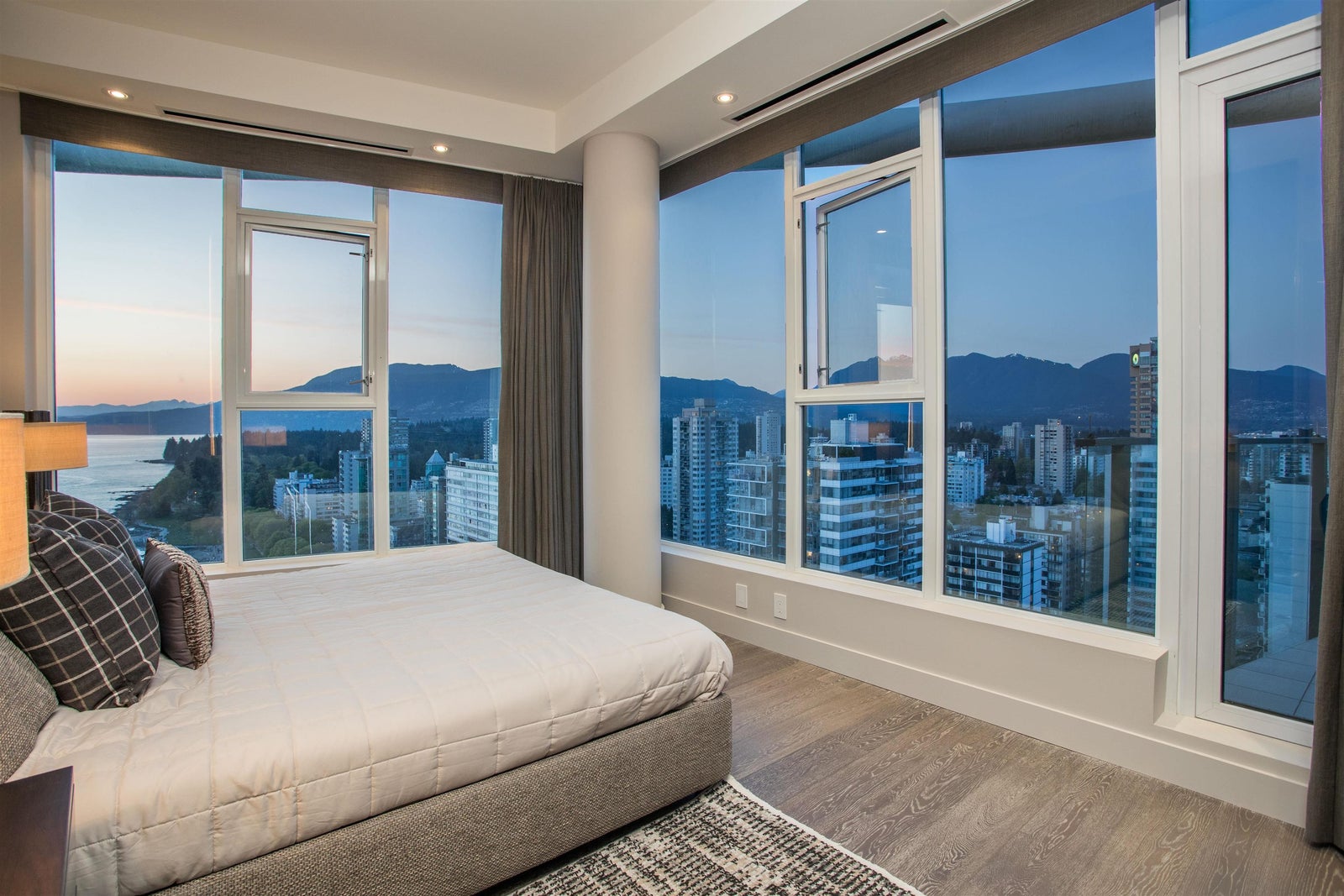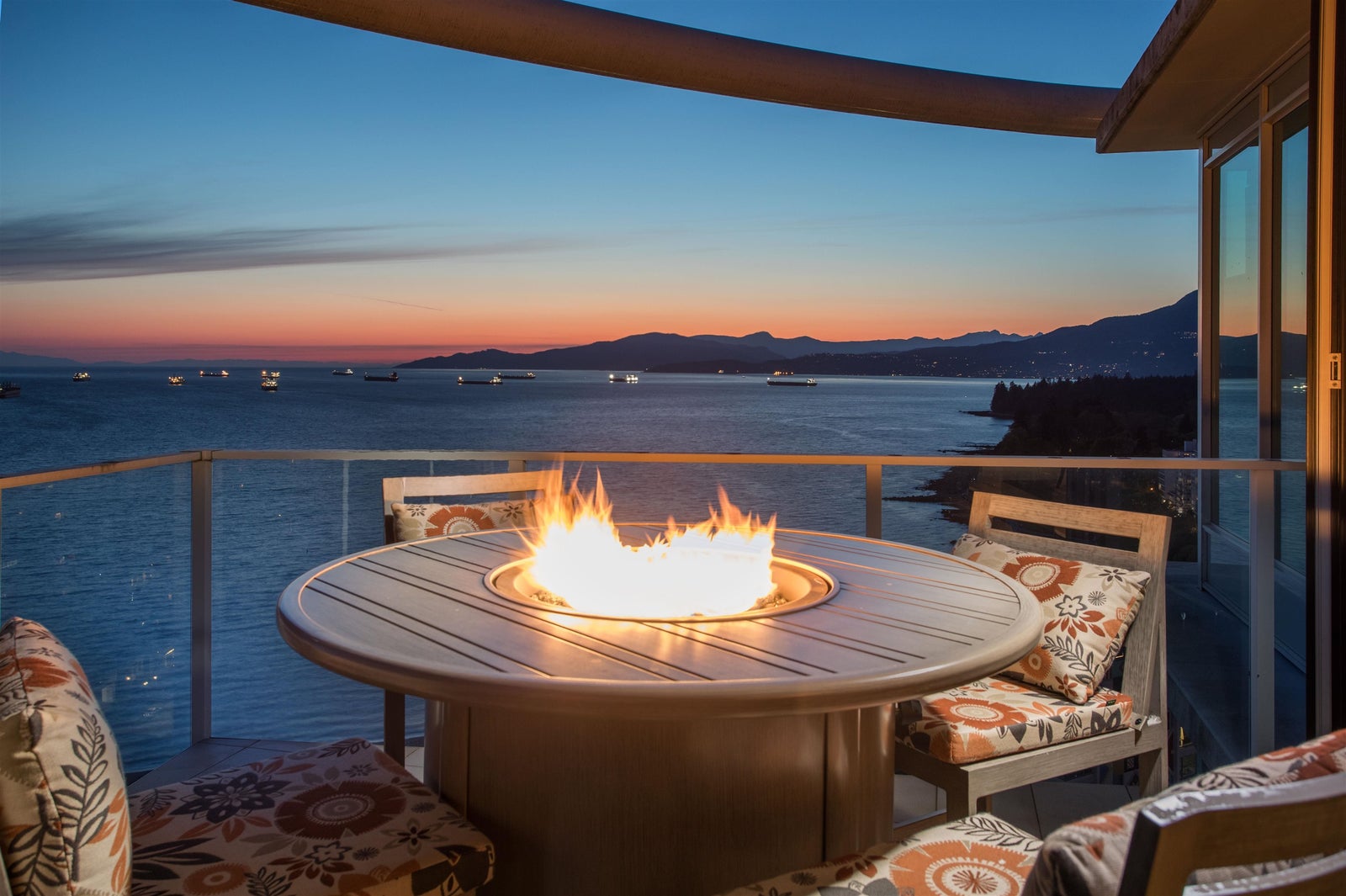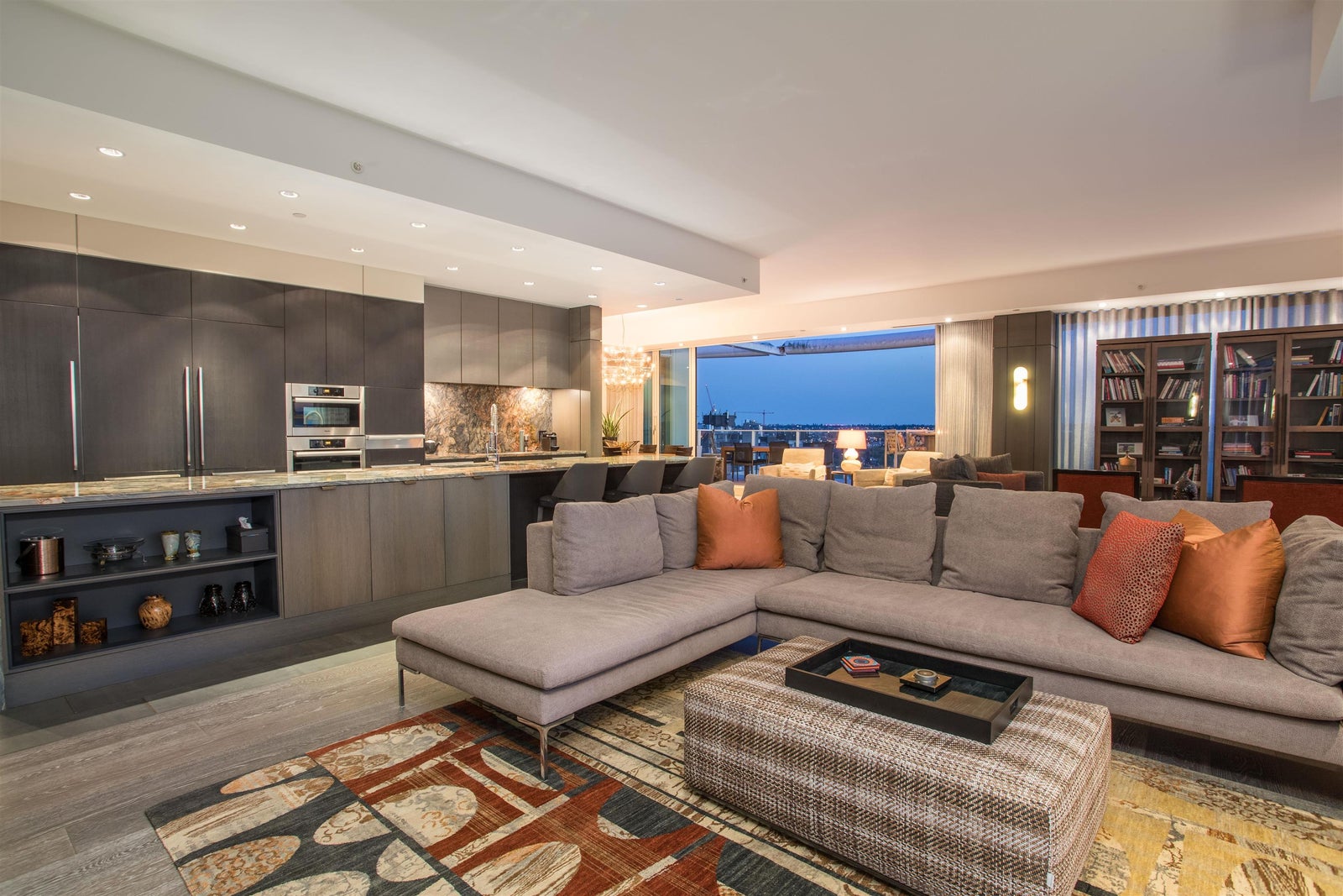 The English Bay Penthouse! Full-floor-2,850 sf PH with 1,500 sf of outdoor space w/ private elevator access and breathtaking all day & night views. Redesigned by Fay Mihailides Design in 2020, it features an 18-ft Wow Fusion kitchen island, Siena tile floors w/ bronze inlay, rift-cut oak wall panels, Rocky Mountain brass hardware, Moooi padded feature walls and custom alabaster lighting. Private primary retreat includes a spa-like ensuite and secluded patio w/ water & mtn views. Two additional ensuite bedrooms also boast private patios and mountain vistas. Two large terraces with multiple lounge zones,lush irrigated gardens & a full outdoor kitchen with Heston BBQ. Rare private 5-car garage outfitted w/ epoxy flooring & smart storage solutions. A true gem! Your only mission is to get home!