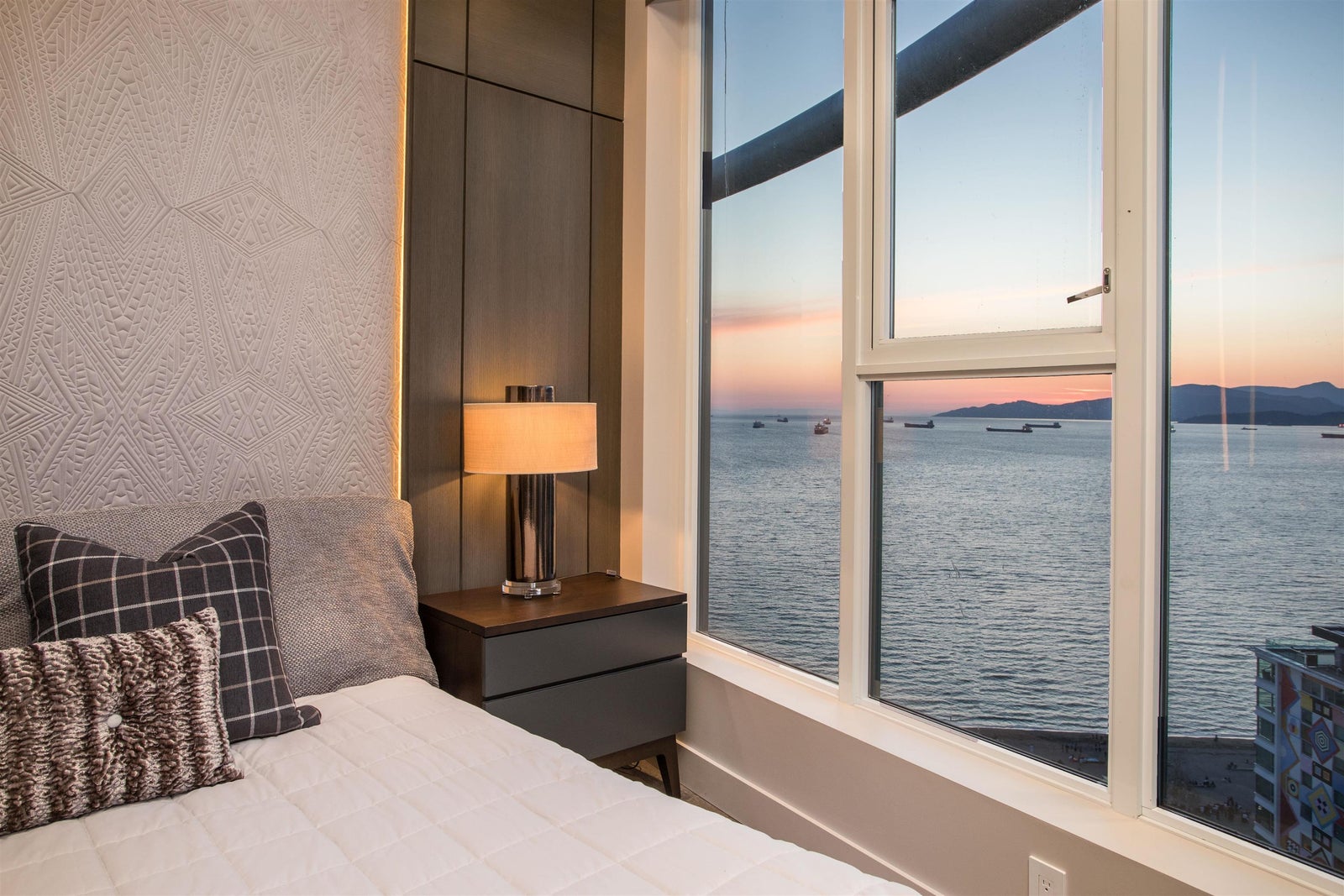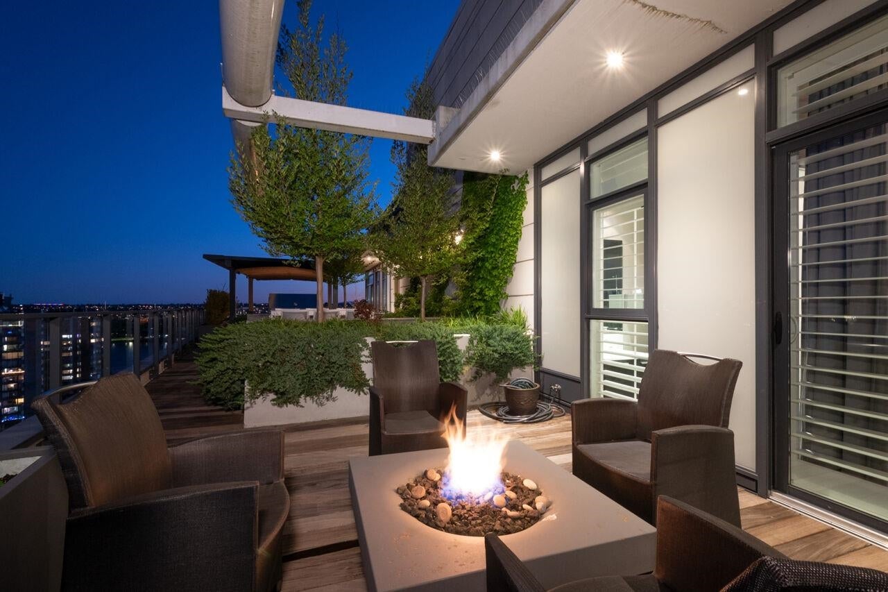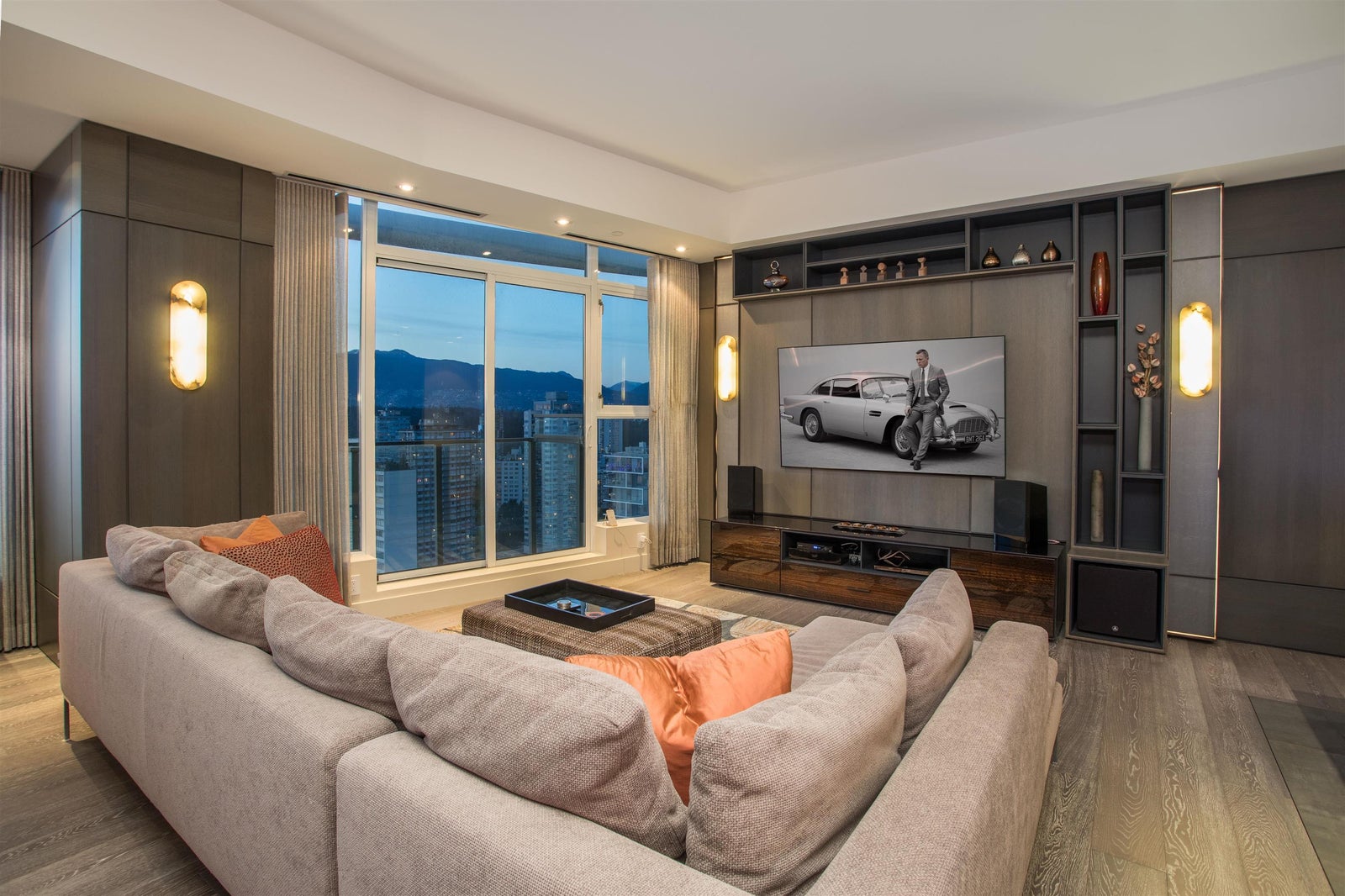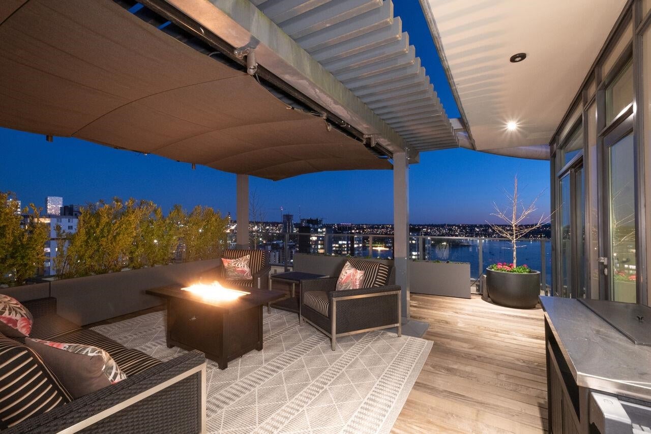 The English Bay Penthouse! Full-floor-2,850 sf PH with 1,500 sf of outdoor space w/ private elevator access and breathtaking all day & night views. Redesigned by Fay Mihailides Design in 2020, it features an 18-ft Wow Fusion kitchen island, Siena tile floors w/ bronze inlay, rift-cut oak wall panels, Rocky Mountain brass hardware, Moooi padded feature walls and custom alabaster lighting. Private primary retreat includes a spa-like ensuite and secluded patio w/ water & mtn views. Two additional ensuite bedrooms also boast private patios and mountain vistas. Two large terraces with multiple lounge zones,lush irrigated gardens & a full outdoor kitchen with Heston BBQ. Rare private 5-car garage outfitted w/ epoxy flooring & smart storage solutions. A true gem! Your only mission is to get home!
